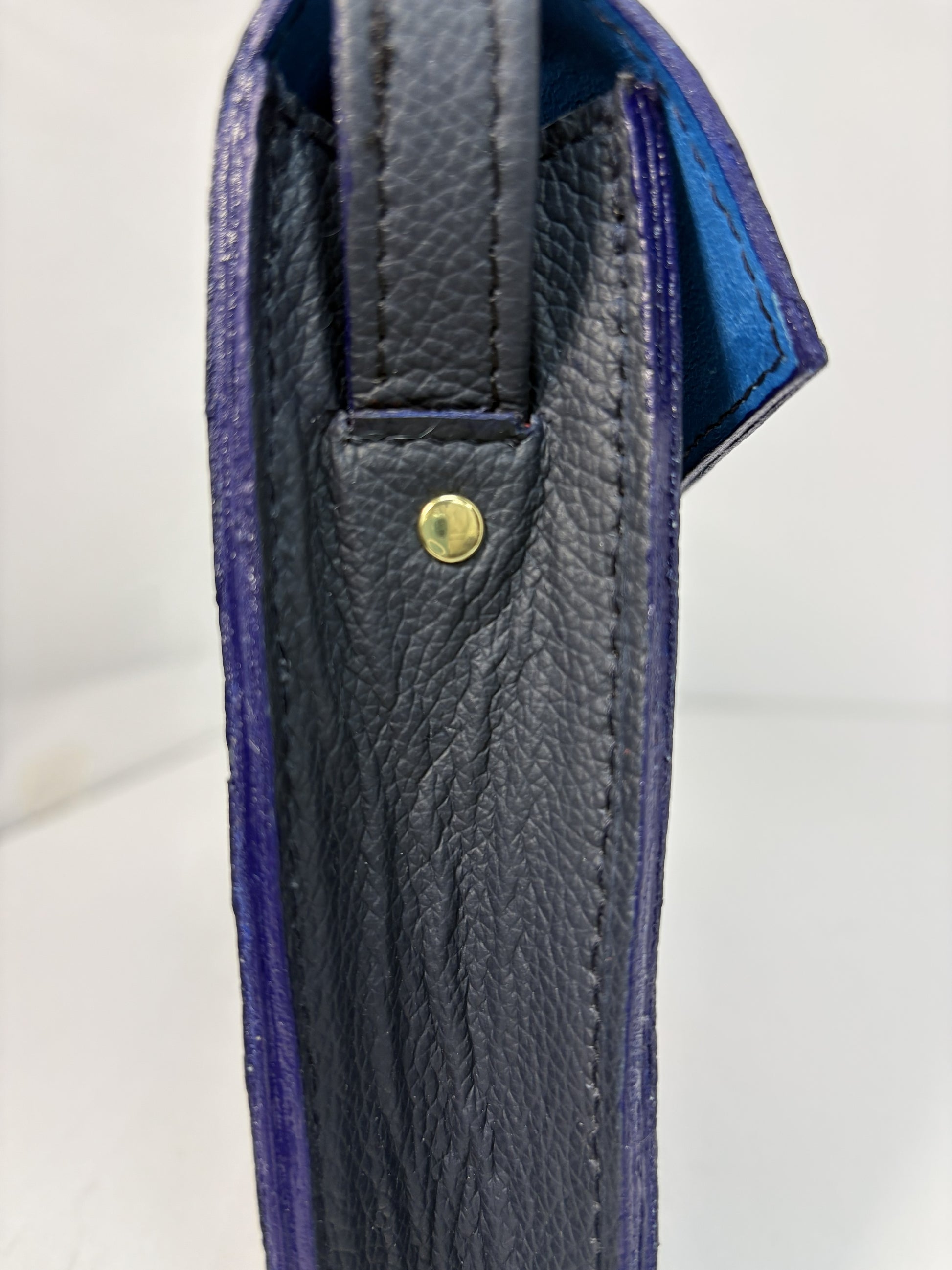 Created in premium indigo blue top-grain leather, the bag offers a refined, lightly pebbled texture that holds its shape beautifully while remaining soft to the touch. The interior reveals a striking contrast—sea-blue leather lining, a signature AJH detail that adds quiet luxury every time the bag is opened.
