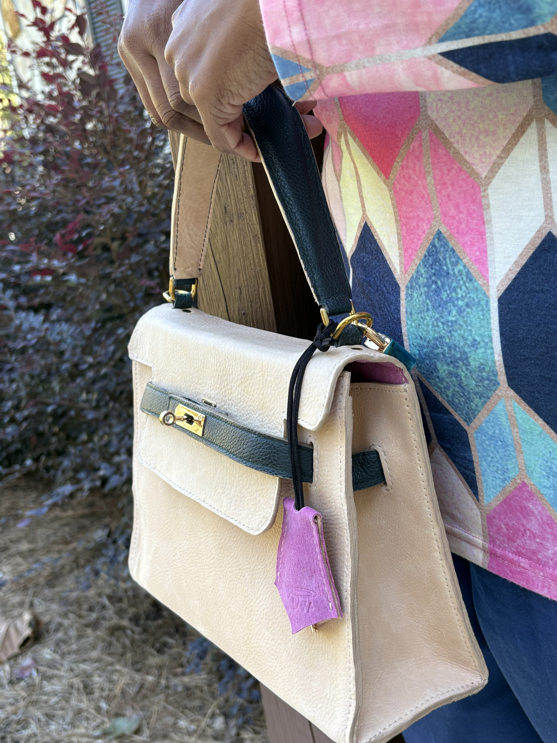 Elevate your style with The Arkin Bag, a refined luxury handbag crafted with a sleek leather exterior and a soft suede interior. Featuring both a top handle and a shoulder strap, this flagship design offers versatile elegance. Choose from two exclusive shades—Moody Pink or Evergreen—to complement your wardrobe. Inside, enjoy organized storage with a leather pocket and a zippered compartment, combining sophistication with practical functionality. Inspired by the iconic Birkin, The Arkin Bag redefines affordable luxury for the discerning individual. Handbag size: 7.5" H x 10.5" W x 4" D, with top handle 13" H