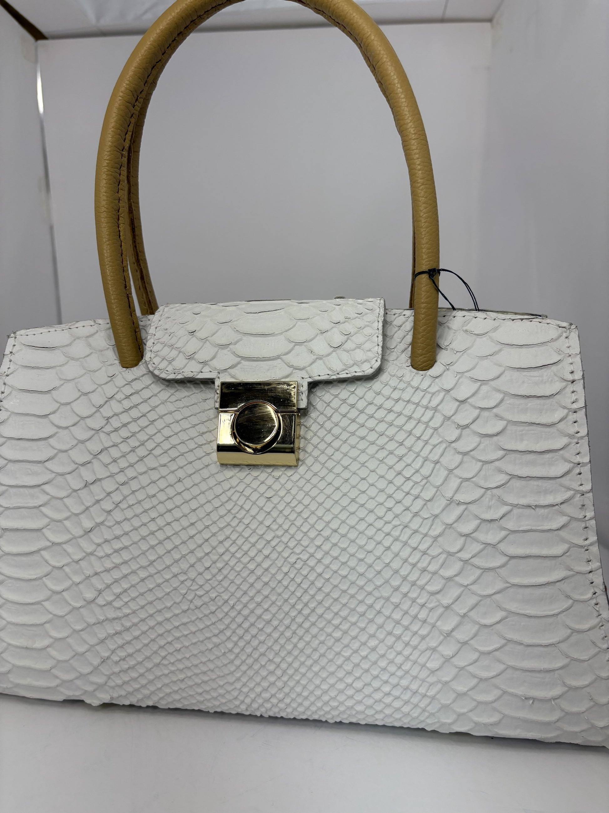 The Brittney is a study in quiet confidence—designed for moments when presence speaks louder than words. Its structured silhouette is crafted in a softly textured white leather with a delicate, alligator-inspired finish, creating depth without excess. The tone is serene and luminous, evoking clarity, calm, and timeless grace.