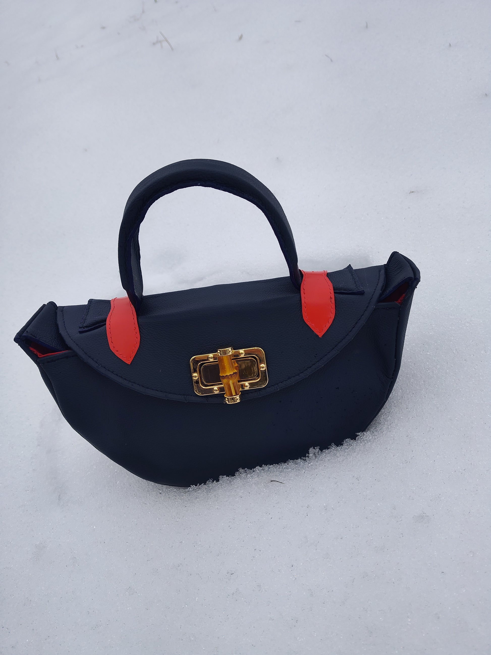 The Elaine Half-Moon Satchel elevates your wardrobe with its half-moon design, crafted from indigo pebble leather and accented with vibrant red. The luxurious gold and bamboo closure adds a statement touch to any outfit, while the handle and crossbody strap offer versatility for everyday wear or special occasions. A must-have for any collection.